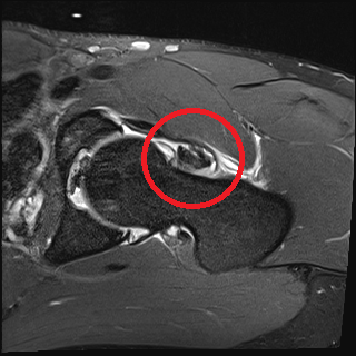 MRT-Bild von einem rechten Hüftgelenk mit Riss der Gelenklippe sowie auch intraartikulärem Knorpelschaden.